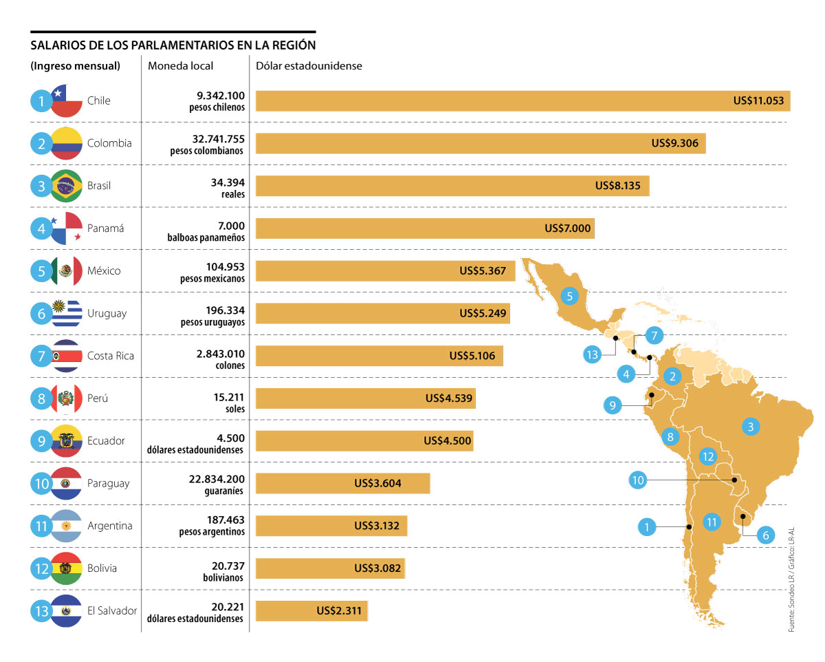 En el listado, que se realizó tras un sondeo que hizo LR con los portales web oficiales de los Parlamentos de cada país, sigue Uruguay, donde los congresistas tienen un salario mensual promedio de US$5.249; y Costa Rica, con US$5.106. Le siguen Perú y Ecuador, con US$4.539 y US$4.500, montos que corresponden a la llamada dieta parlamentaria. Los países que perciben los salarios más bajos son Bolivia y El Salvador, con cantidades mensuales de US$3.082 y US$2.311, respectivamente.