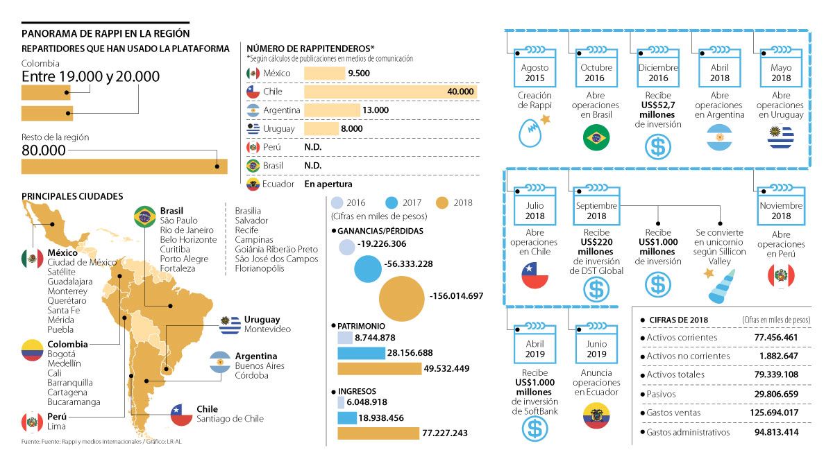 Una constante de Rappi es que mantiene en crecimiento sus ingresos y su patrimonio, pero también sus pérdidas. Para cierre del año pasado, la startup colombiana reportó un total de $77.227 millones en ingresos y cerca de $49.532 correspondientes a patrimonio. Sin embargo, la cifra de pérdidas de final de 2018 ascendió a $156.014 millones. De acuerdo con expertos, la razón de esta constante cifra en rojo en las ganancias de Rappi tiene que ver con la inversión que la compañía ejecuta para continuar con su expansión en la región.