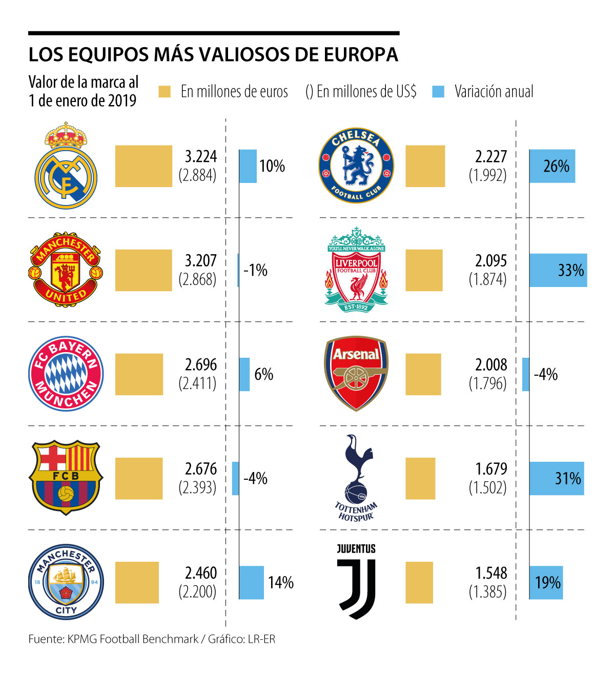 El equipo que lidera el estudio Football Clubs’ Valuation: The European Elite 2019, es el Real Madrid, con un valor de marca de 3.224 millones de euros (US$2.884 millones), esto es un 10% más frente al año pasado. El segundo es Manchester United, con un valor de 3.207 millones (US$2.868 millones), esto es 1% menos frente a 2018. Ambos equipos, son los únicos clubes con una cifra superior a los 3.000 millones de euros.