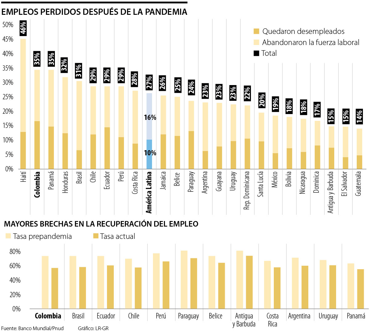 Además, según el informe del Banco Mundial y del Pnud, Colombia es el segundo país de América Latina, después de Haití, que más empleos ha perdido tras la pandemia, con un 36% de trabajos destruidos y aproximadamente la mitad de los adultos en edad productiva que abandonaron la fuerza laboral después de quedar desempleados durante la pandemia.
