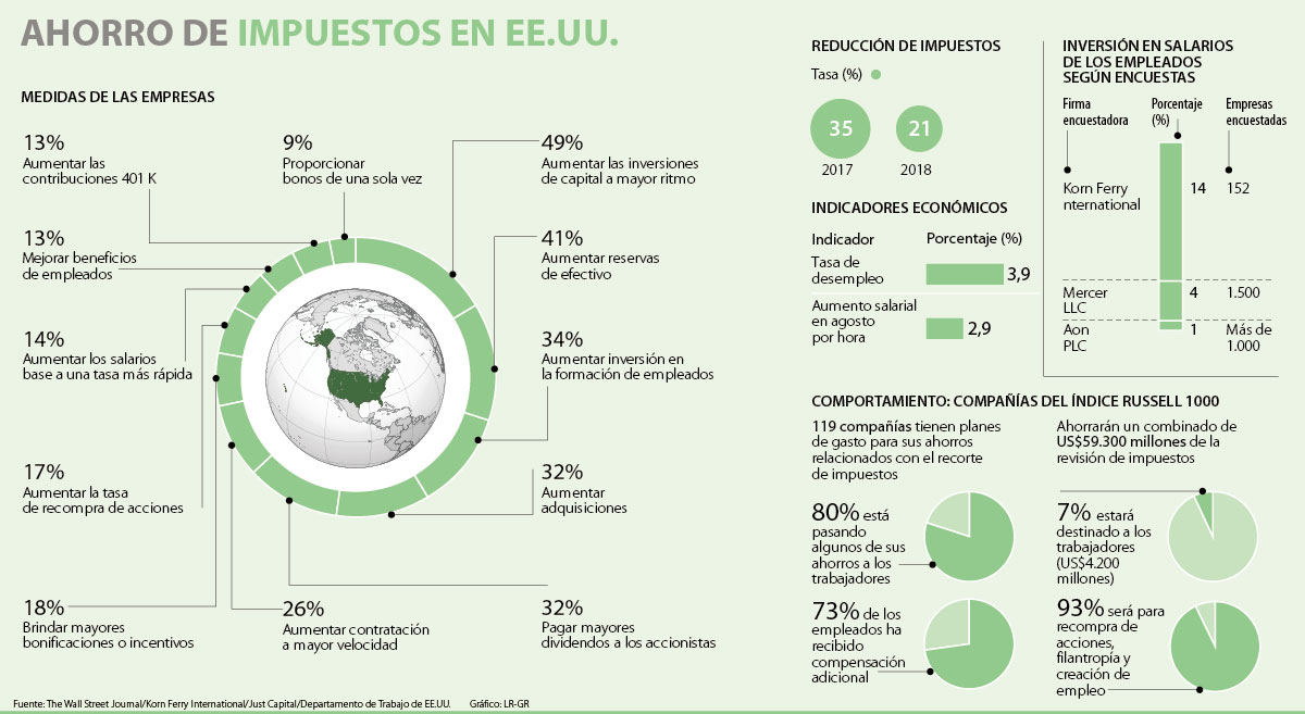 No obstante, los beneficios que esta reducción ha otorgado a las empresas no ha impactado a sus empleados con el incremento de los salarios que perciben. Según una encuesta realizada por Korn Ferry International, solo 14% de las 152 empresas consultadas invierte el dinero que queda del recorte de impuestos corporativos en aumentar el sueldo de sus trabajadores.