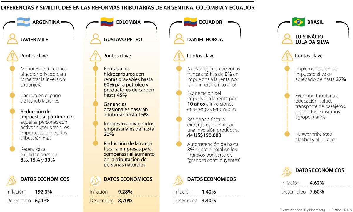 En el caso de los argentinos, la crisis económica en la que está sumida el país creó una necesidad de promover proyectos centrados principalmente en el recaudo vía impuesto renta; por el lado del vecino Ecuador, que no vive su mejor momento macro y otros temas efecto del orden público, llevaron a que el Gobierno de Daniel Noboa ha tenido que asumir un déficit fiscal de US$5.000 millones (que representa casi 4% de su Producto Interno Bruto) por eso será más laxo para promover la inversión extranjera; mientras que Brasil se dedicará a las modificaciones en el IVA.