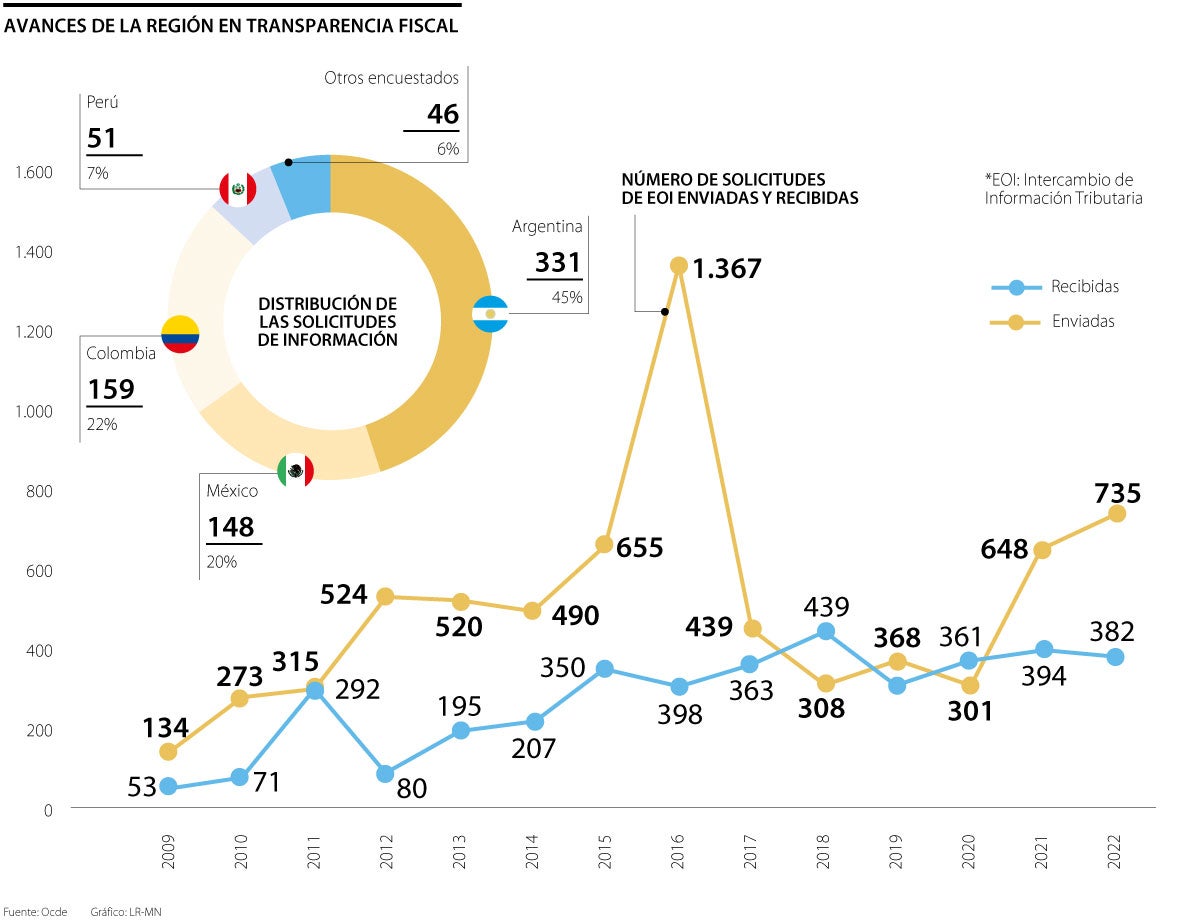 Por ejemplo, el intercambio de información tributaria o (EOI) en la región mostró un avance en sus solicitudes alcanzando 735 en 2022, aún así este número se concentra en unos pocos países como Argentina, Colombia, México y Perú, que representaron más de 90%. Pero de los países evaluados, ya son seis los que cuentan con una calificación “Ampliamente Conforme”, en cuanto a la implementación de estas políticas.
