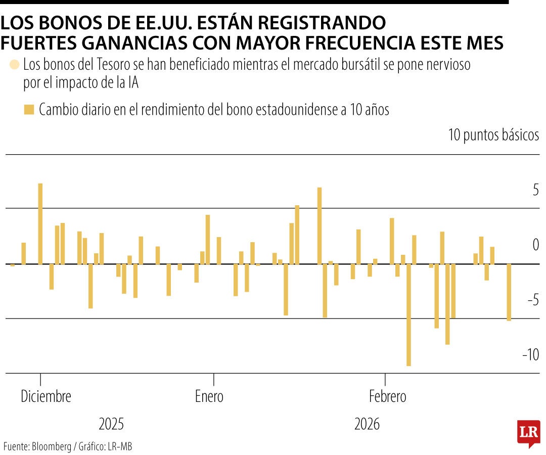 Los rendimientos se mantuvieron prácticamente sin cambios, con el bono a 10 años cerca del 4,03%. El mínimo del lunes, justo por debajo del 4,02%, fue el rendimiento más cercano al 4% desde finales de noviembre. Ha caído desde un máximo del 4,30% a principios de este mes, con las acciones estadounidenses acosadas por las preocupaciones en torno a la inteligencia artificial y la política comercial estadounidense. Los inversores también están atentos a un posible ataque militar estadounidense contra Irán, ya que la demanda de activos refugio compensa la amenaza inflacionaria derivada del aumento de los precios del petróleo.