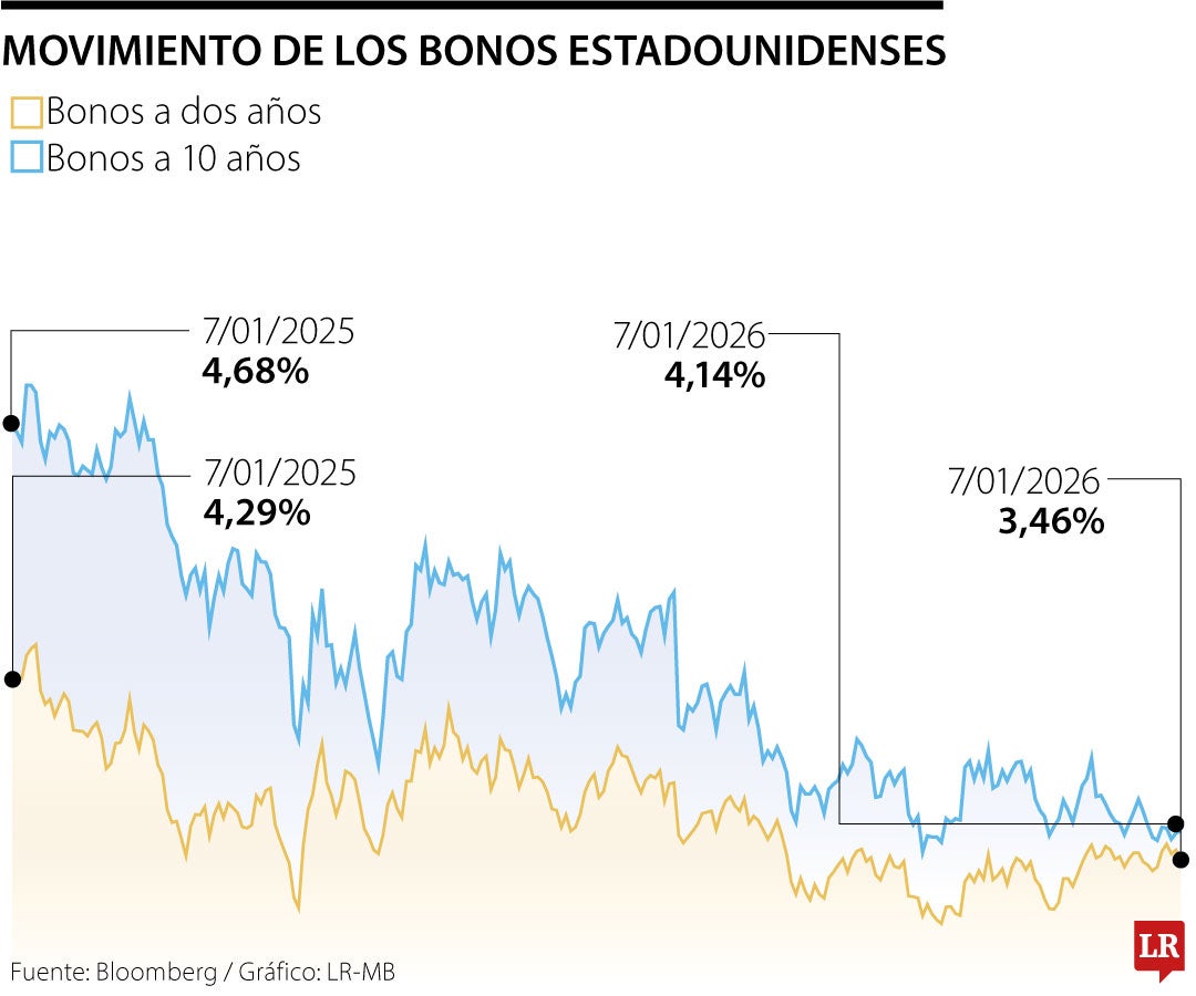 El rendimiento de la nota a 2 años, que suele moverse al ritmo de las expectativas de tasas de interés, bajaba 0,3 puntos básicos en el día, al 3,47%, mientras que el de la deuda a 10 años caía 2,6 puntos básicos, al 4,153%.