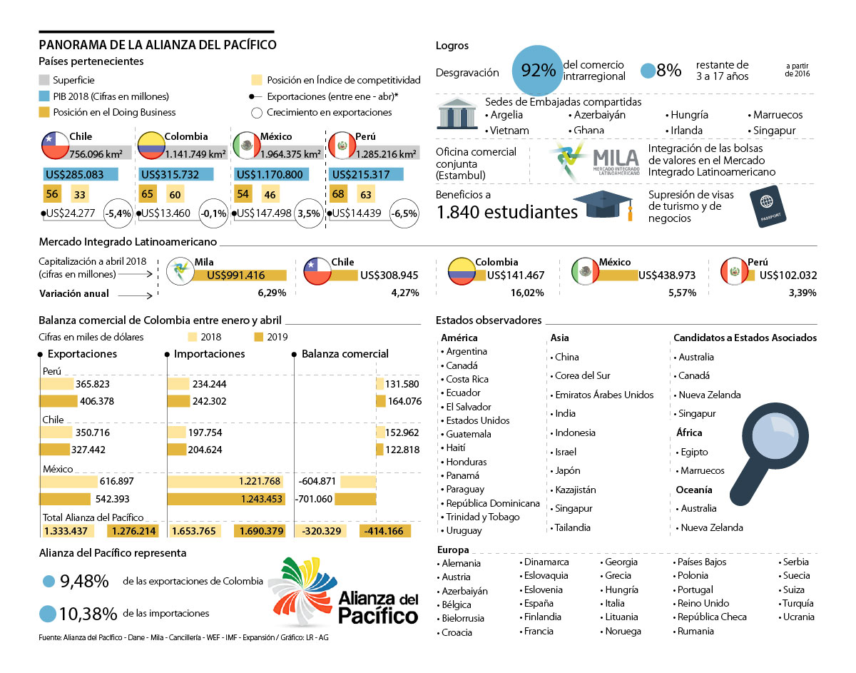 Así mismo, se hablará de la integración financiera y de mecanismos que permitan el fomento de este ítem. Uno de los principales logros de la Alianza del Pacífico durante sus ocho años de existencia fue la integración de las bolsas de valores en el Mercado Integrado Latinoamericano (Mila). En lo corrido del año, con cierre a abril, esta había crecido 6,29%, impulsado por el crecimiento colombiano, que ha sido de 16,02%.
