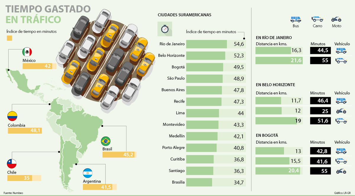 Río de Janeiro, Belo Horizonte y Bogotá son las ciudades suramericanas en las que, en promedio, las personas se demoran más transportándose de un lugar a otro.
