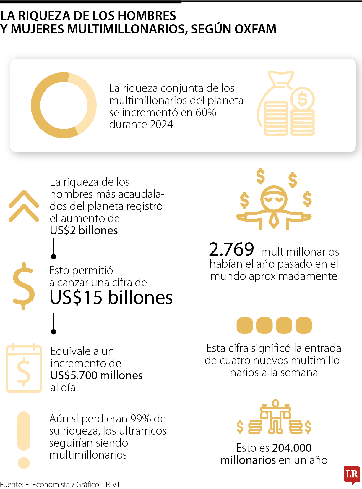 La riqueza conjunta de los multimillonarios del planeta se incrementó en 60% durante el año 2024, pese a que la actividad económica global mantiene un dinamismo más moderado al promedio que tenía entre el año 2000 y el 2019, revela un informe de la Organización No Gubernamental (ONG) Oxfam.