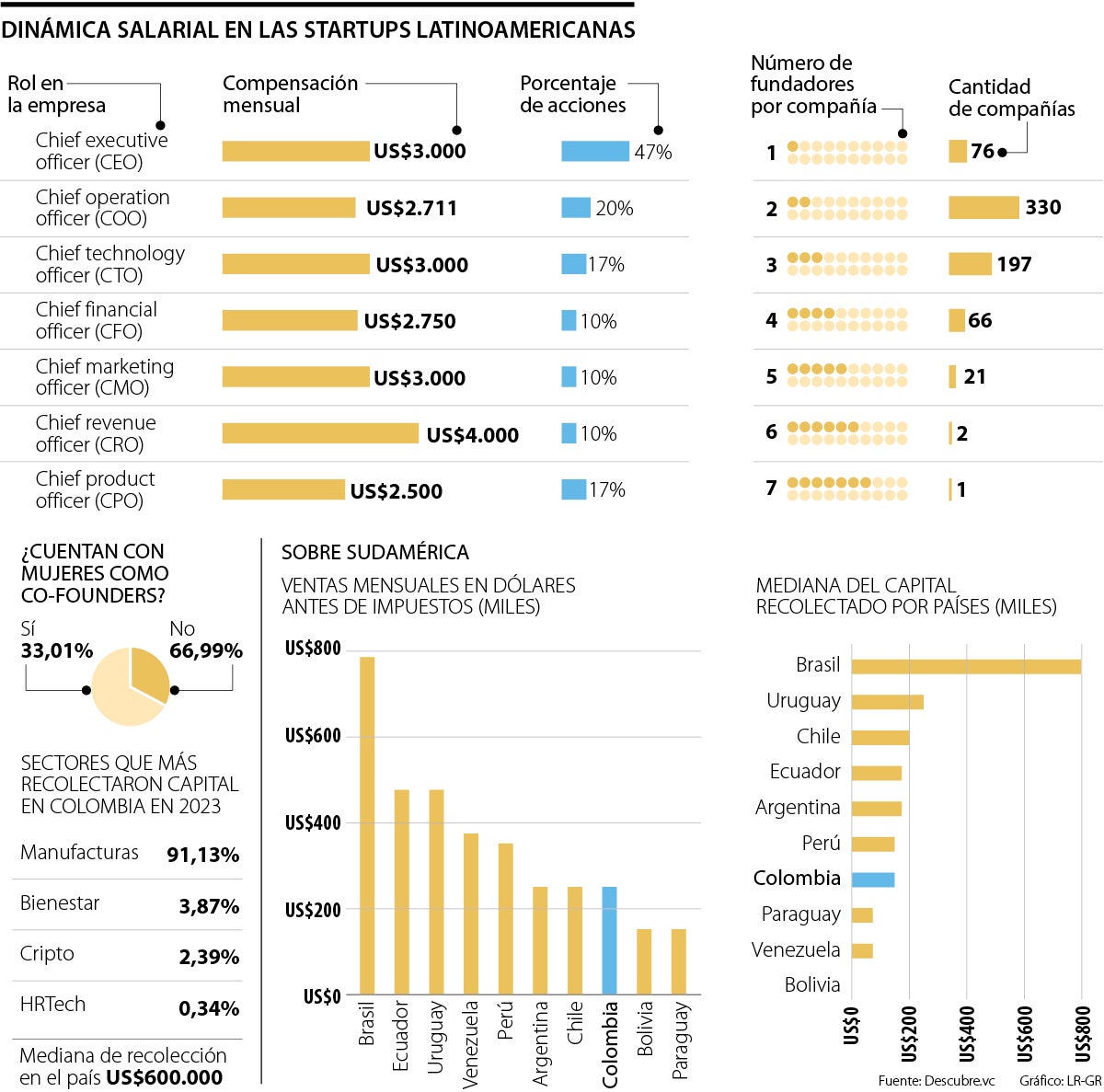 En el análisis de Sudamérica de descubre.vc, Brasil es el mejor posicionado tanto en la mediana de ventas anuales como en la del capital recolectado en la región; en ambos aspectos, la cifra fue de US$800.000. Por otro lado, en Colombia se recolectaron US$600.000 y el sector que más aportó en este rubro fue las startups de manufactura con 91,1%, seguido de startups de bienestar y cripto con 3,87% y 2,39% respectivamente según los expresado en el estudio.