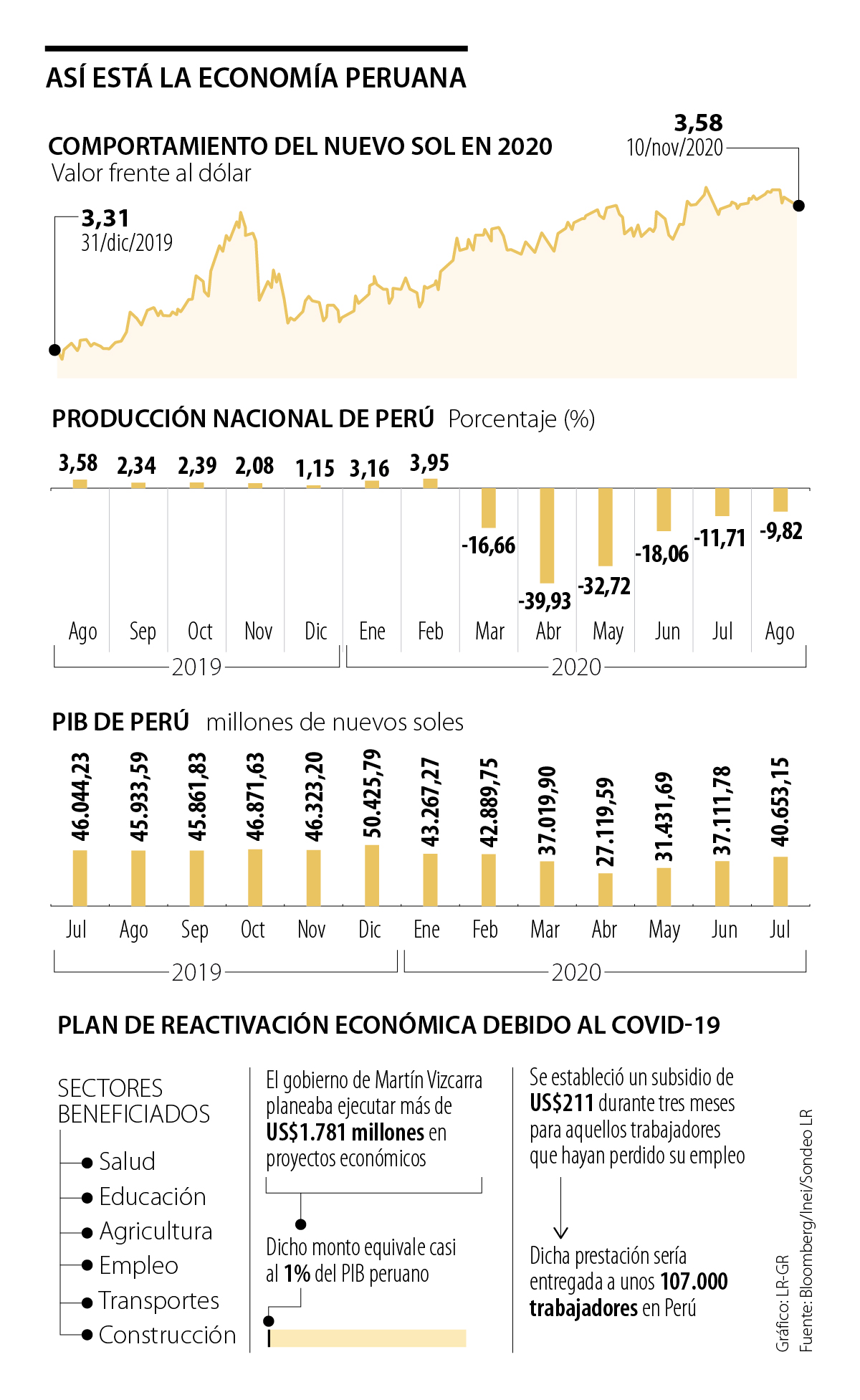 Todo esto se suma a unos datos de producción nacional negativos desde el inicio de la pandemia. Según datos del Instituto Nacional de Estadística Informática (Inei), la última cifra registrada es de -9,82% con corte al mes de agosto, momento en que apenas se empezaban a evidenciar los primeros índices de recuperación frente a los datos de abril, que llegaron a -39,93%.