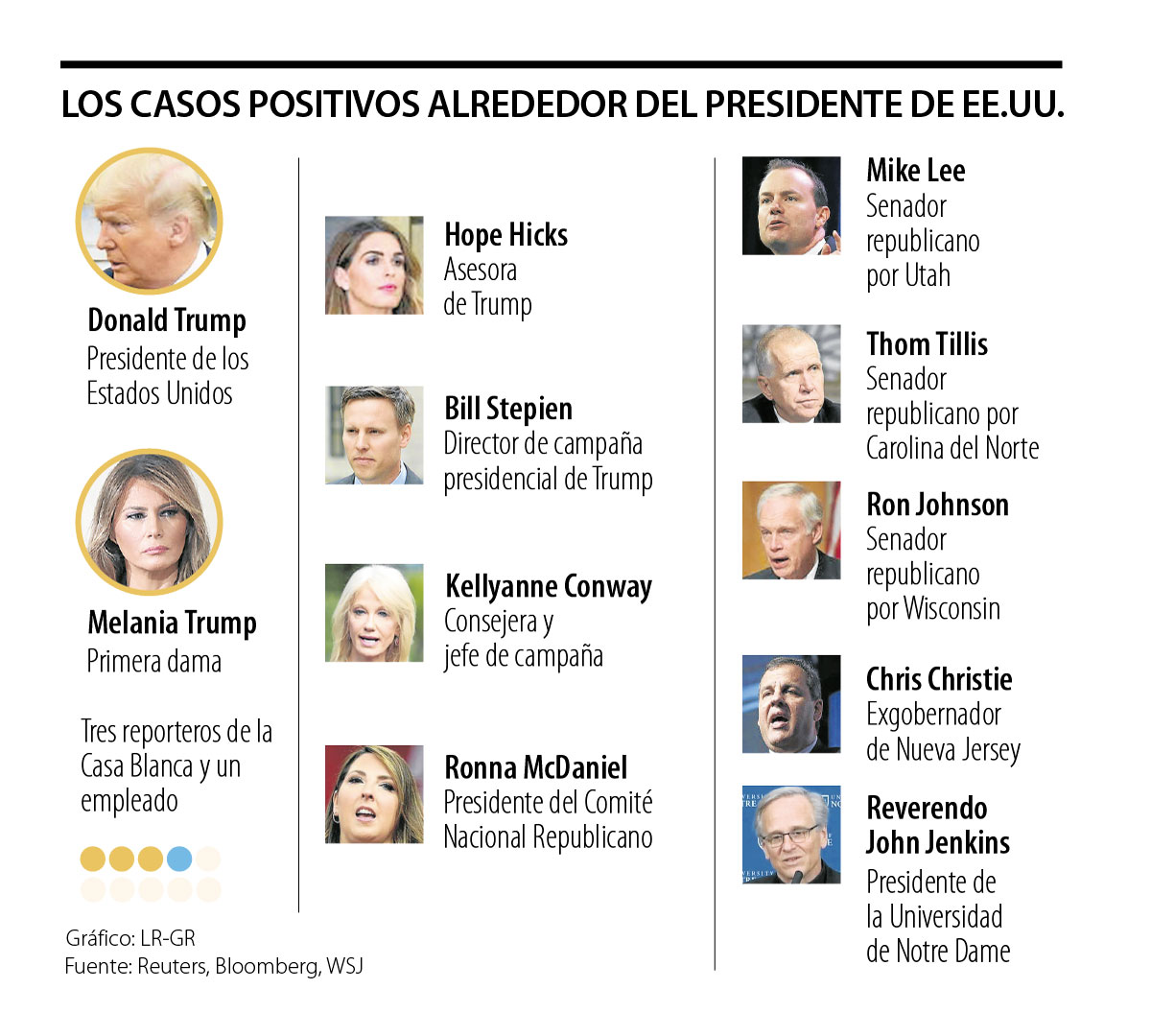 Pero la salud del presidente Trump no es la única que preocupa, especialmente a la campaña presidencial que busca una reelección contra el candidato Joe Biden. Después de conocerse el resultado del Presidente y la primera dama, Melania Trump, nueve personas más de su equipo se vieron afectadas por la cercanía con el dirigente. Nombres como Hope Hicks, Bill Stepien, Kellyanne Conway y Ronna McDaniel resaltan dentro de los afectados. (Ver gráfico)