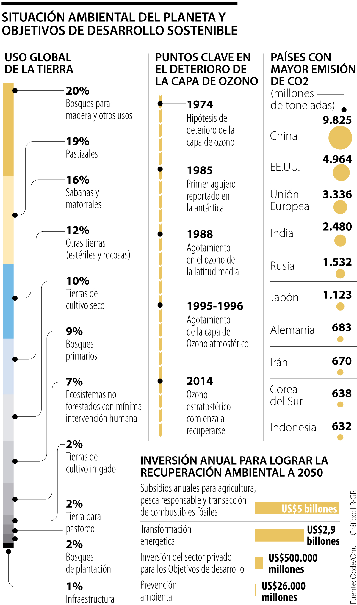 Transformar este panorama climático para cumplir con la Agenda 2030 propuesta por la ONU y lograr emisiones cero en 2050 requerirá una inversión de US$2.600 millones en acciones ambientales preventivas, así como una inyección anual de US$90.000 millones en protección de la biodiversidad, US$5 billones en subsidios para la agricultura, la pesca responsable y la transición hacia energías alternativas, y una contribución anual del sector privado de US$500.000 millones para proyectos de recuperación ambiental.