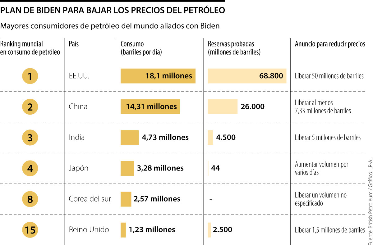 Estados Unidos se alió con China, Japón, India, Corea del Sur y el Reino Unido en un intento coordinado inédito para congelar los precios del crudo y mitigar los efectos de la inflación que está golpeando los mercados mundiales.