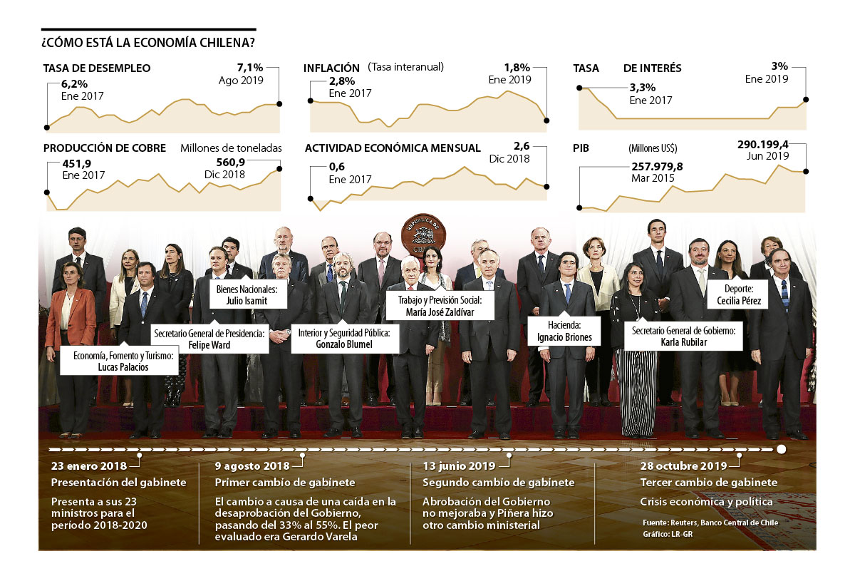 Para darle solución a la crisis política y social que hoy vive el país suramericano, el pasado sábado Sebastián Piñera le solicitó al gabinete ministerial que pusieran sus cargos a disposición del Gobierno, a fin de tener la libertad de hacer los cambios que él consideraba necesarios para atender la crisis que vive Chile. Así las cosas, ayer Piñera cambió a ocho ministros de los 23 que integran en total el equipo, lo que se convierte en el tercer cambio ministerial en un años y dos meses. Entre las fichas clave estuvieron los ministros de Hacienda e Interior y Seguridad Pública.