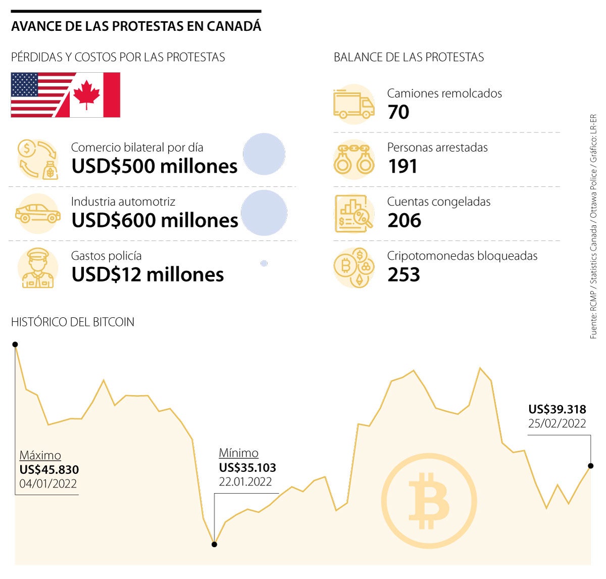 Hasta el momento la Royal Canadian Mounted Police (Rcmp) ha identificado más de 253 direcciones de criptobilleteras, sobre las cuales se impuso una orden de bloqueo. De igual forma, fueron congeladas más de 206 cuentas bancarias que manejaban fondos relacionados con las protestas y los bloqueos.