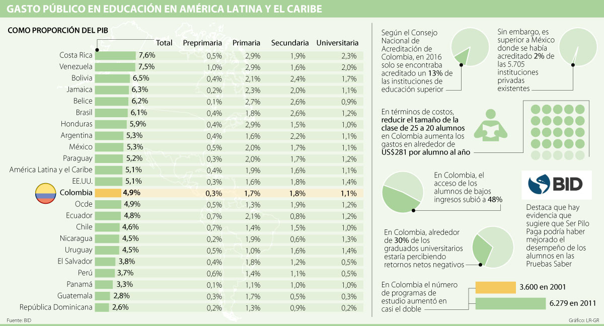 Catherine Pereira, directora del programa de Administración de Negocios Internacionales de la Universidad de la Sabana, consideró que “en términos generales, el porcentaje del PIB destinado a educación sigue siendo bajo y la preparación de las titulaciones por cada 100.000 habitantes es muy baja”. Aunque el BID, en el caso colombiano, resaltó programas como Ser Pilo Paga, pues “muestran una mejora del desempeño en las pruebas de los alumnos de secundaria, sobre todo entre los alumnos de nivel socioeconómico más bajo”, llama la atención sobre los mecanismos de garantía y calidad. “Por ejemplo, en Colombia solo 13% de las instituciones de educación superior estaba acreditado en 2016”, manifestó el organismo multilateral.