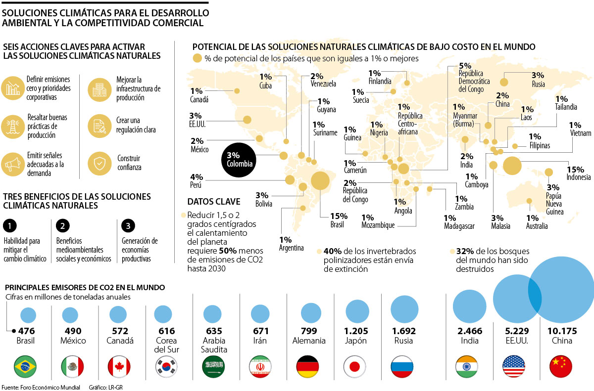 De acuerdo con esto, el FEM reveló en su estudio que los proyectos de recuperación ambiental con mayor proyección están aumentando en regiones como América Latina, donde en Brasil se ubican 15% de las iniciativas de menor costo y con mayor impacto en el mundo. Luego está Perú, con 4%; Colombia (3%), México (2%) y Argentina, con 1% de los proyectos de soluciones climáticas naturales.