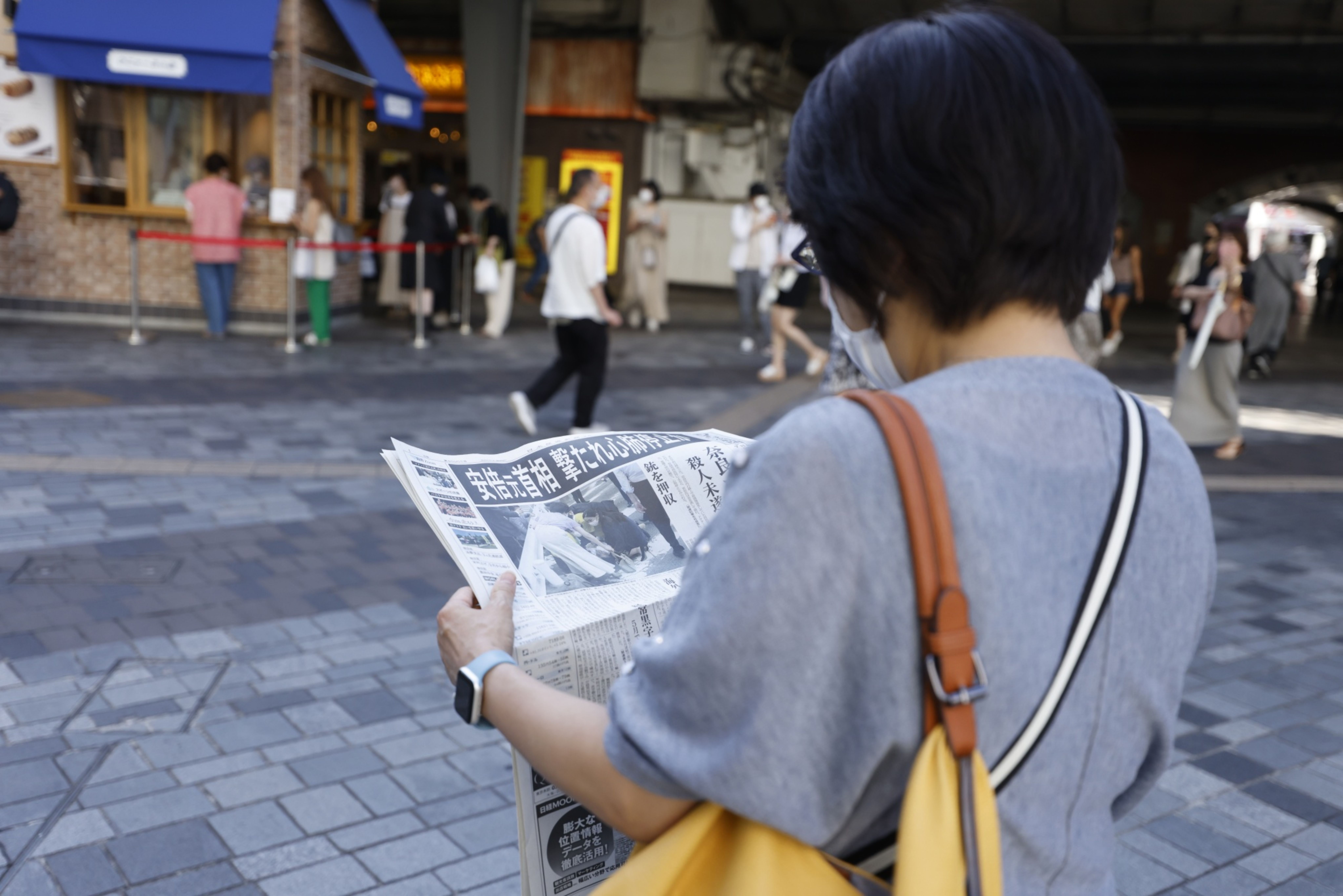 Una mujer lee una copia del periódico Nikkei con un informe de primera plana sobre el ex primer ministro japonés Shinzo Abe, el primer ministro con más años de servicio y una figura de influencia perdurable.
