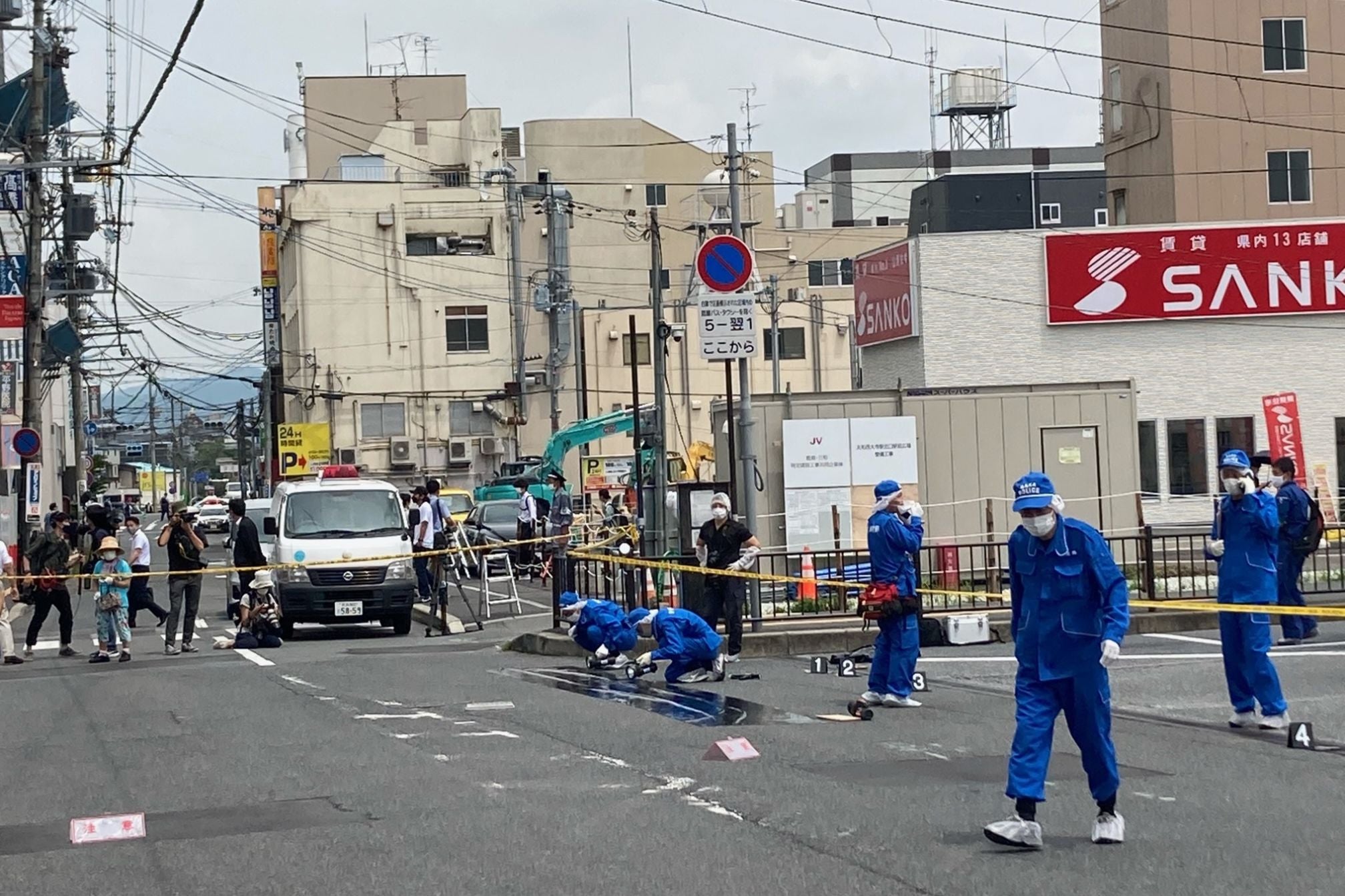 Oficiales de policía en la escena donde le dispararon al ex primer ministro japonés Shinzo Abe durante un evento político en Nara, Japón.