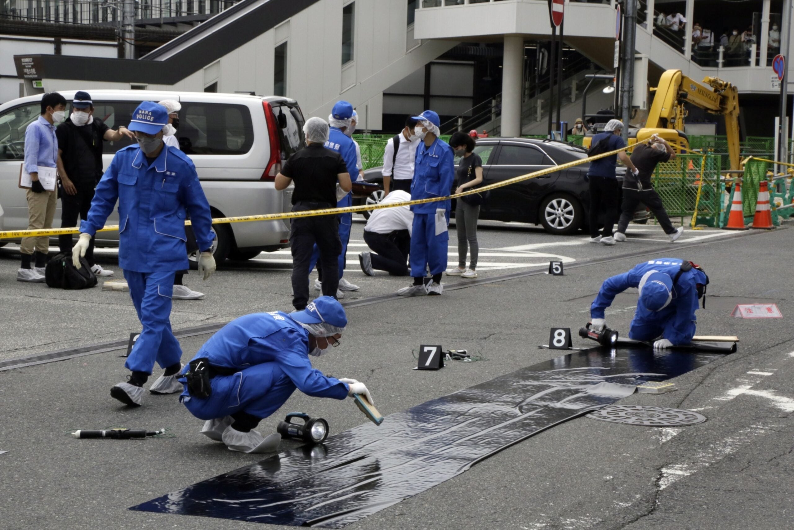 Foto: Oficiales de policía en la escena donde le dispararon al ex primer ministro japonés Shinzo Abe durante un evento político en Nara, Japón.