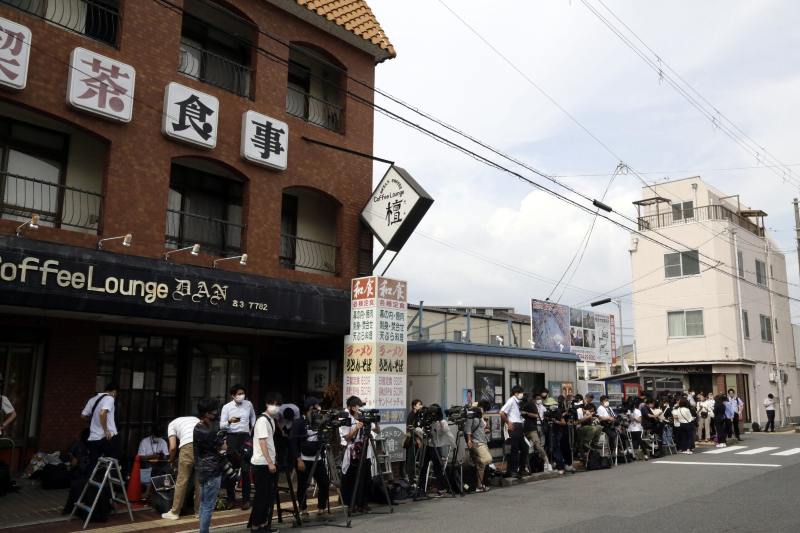 Miembros de los medios de comunicación se reúnen frente al Hospital de la Universidad Médica de Nara, donde el ex primer ministro japonés Shinzo Abe fue llevado después de recibir un disparo durante un evento político en Nara, Japón, el viernes 8 de julio de 2022.