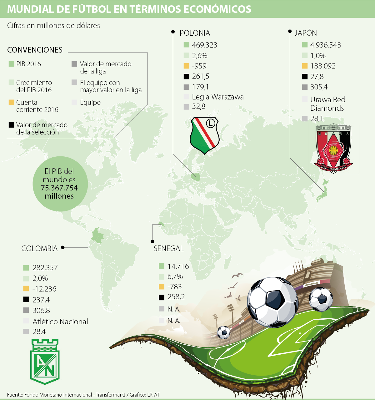 Por otro lado, LR miró el valor de mercado de las selecciones, de la liga de estos países y del equipo nacional más valorado. El valor monetario de las selecciones, las ligas y los equipos locales se tomaron del portal web Transfermarkt, que calcula estos datos con base en el precio de los jugadores.