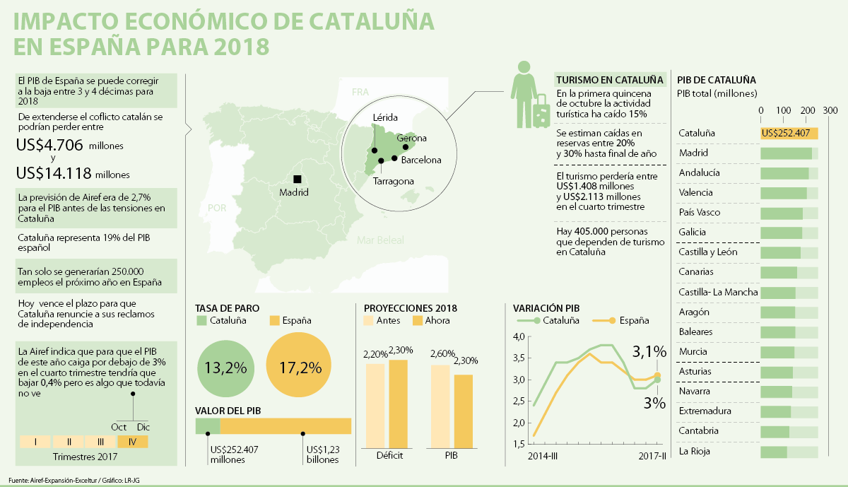 Hoy vence el plazo que le dio el Gobierno español a Cataluña para que defina si continúa con sus planes independentistas. De hacerlo, la Autoridad Independiente de Responsabilidad Fiscal (Airef) estima que España perderá entre 0,4 y 1,2 puntos porcentuales de la proyección de su PIB para 2018. De esta manera, el crecimiento económico del país europeo caería a 2,3%, una revisión que hizo el Gobierno esta semana y que fue ratificada por la Airef.