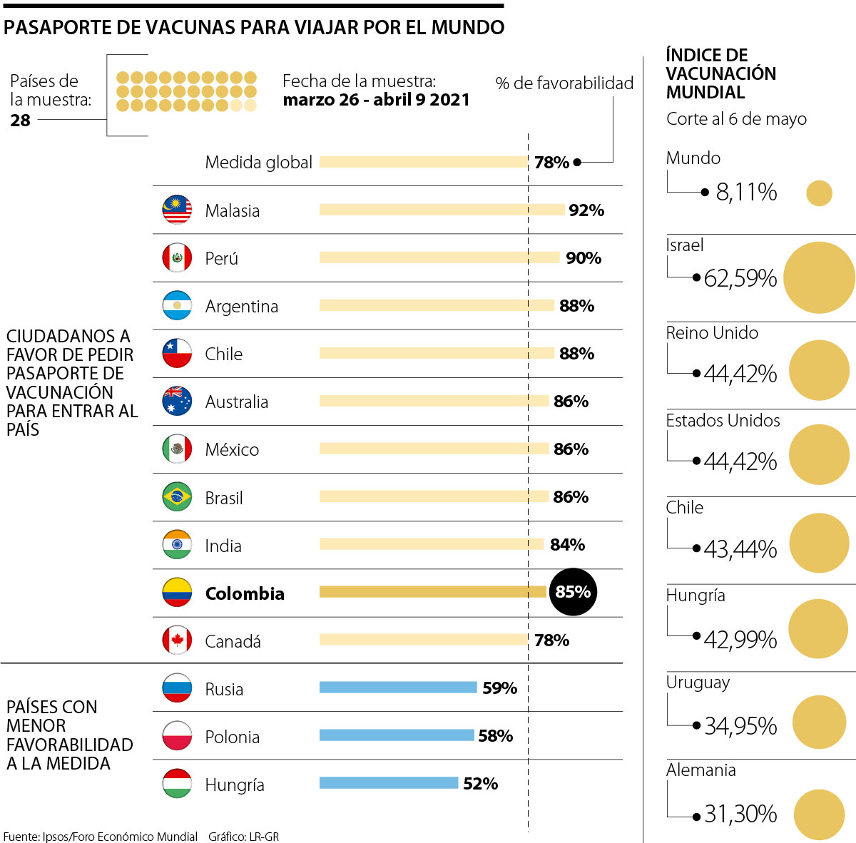 De hecho, entre los países a favor de implementar el pasaporte sanitario, solo Israel, con 62,59% de la población vacunada, sobrepasa la mitad de inmunizados respecto a su población.