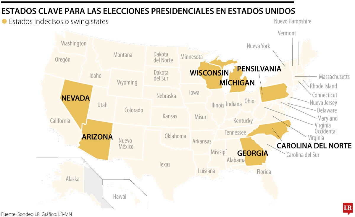 Nevada, Arizona, Wiscosin, Michigan, Pensilvania, Carolina del Norte y Georgia tienen la última palabra a la hora de elegir, entre Kamala Harris y Donald Trump, sobre quién llegará a la Casa Blanca en el próximo periodo presidencial. Estos estados, denominados “swing states” concentran la atención de los candidatos en las últimas cuatro semanas de campaña por su poder de inclinar la balanza el 5 de noviembre.