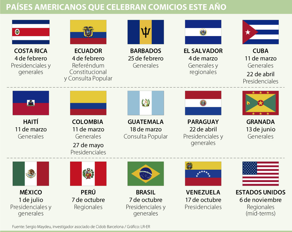 En 2018, 15 países del continente celebrarán comicios y en siete de ellos se harán para elegir a su próximo presidente. La primera economía que lo hará es Costa Rica, donde se realizarán elecciones el próximo 4 de febrero. Las encuestas las lidera Antonio Álvarez, candidato del Partido Liberación Nacional, y lo sigue Juan Diego Castro, del Partido Integración Nacional.