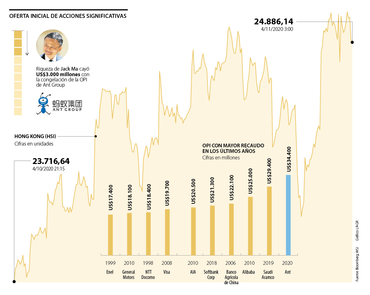 Esta semana la bolsa de Hong Kong ha estado conmocionada por la suspensión de Ant Group que pretendía empezar a cotizar hoy. Durante la Oferta Inicial de Acciones (OPI), la fintech esperaba recaudar más de US$34.500 millones, lo que sería la mayor cifra en la historia.