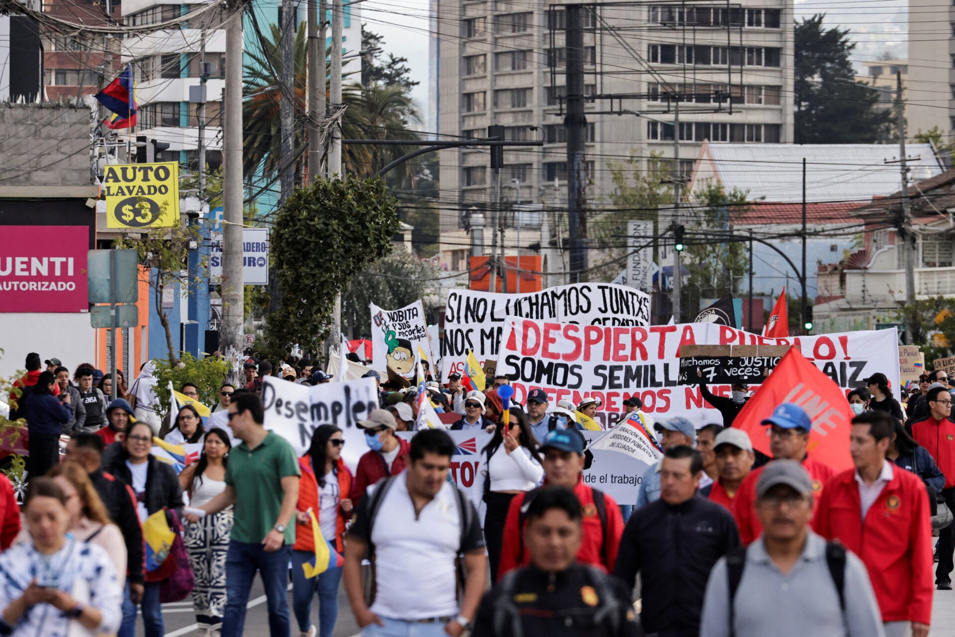 Manifestantes con una bandera de Ecuador y un cartel que dice "Juntos por una economía justa y solidaria" protestan contra las políticas del gobierno del presidente Daniel Noboa en Quito, Ecuador.