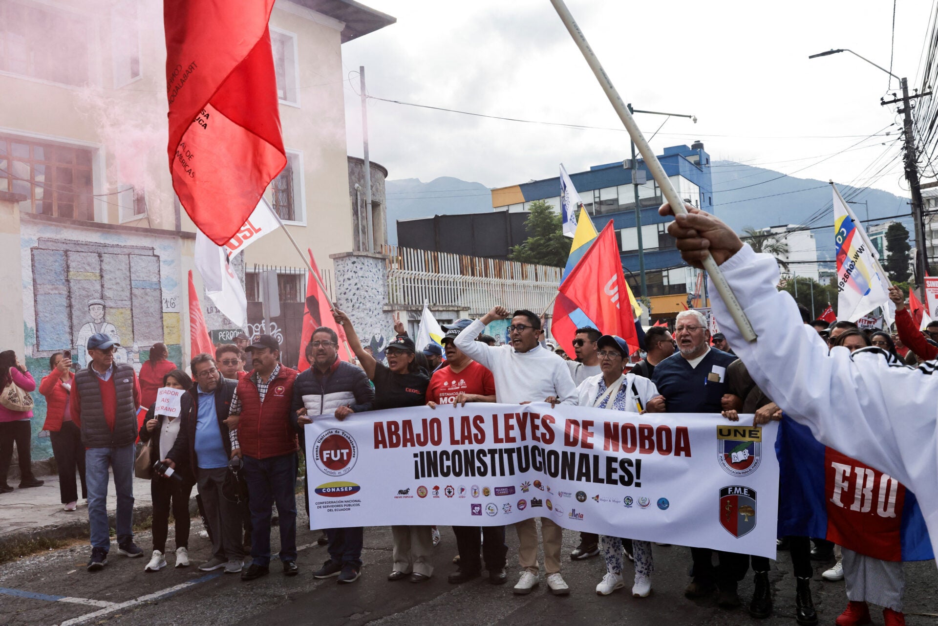 Diversas organizaciones sociales marcharon este jueves 8 de agosto de 2025 en el centro de Quito para expresar su rechazo a varias decisiones del presidente Daniel Noboa. La manifestación fue convocada por el Frente Unitario de Trabajadores, FUT, la Unión Nacional de Educadores, UNE, la Fenocin y otras agrupaciones sociales, indígenas y sindicales.
