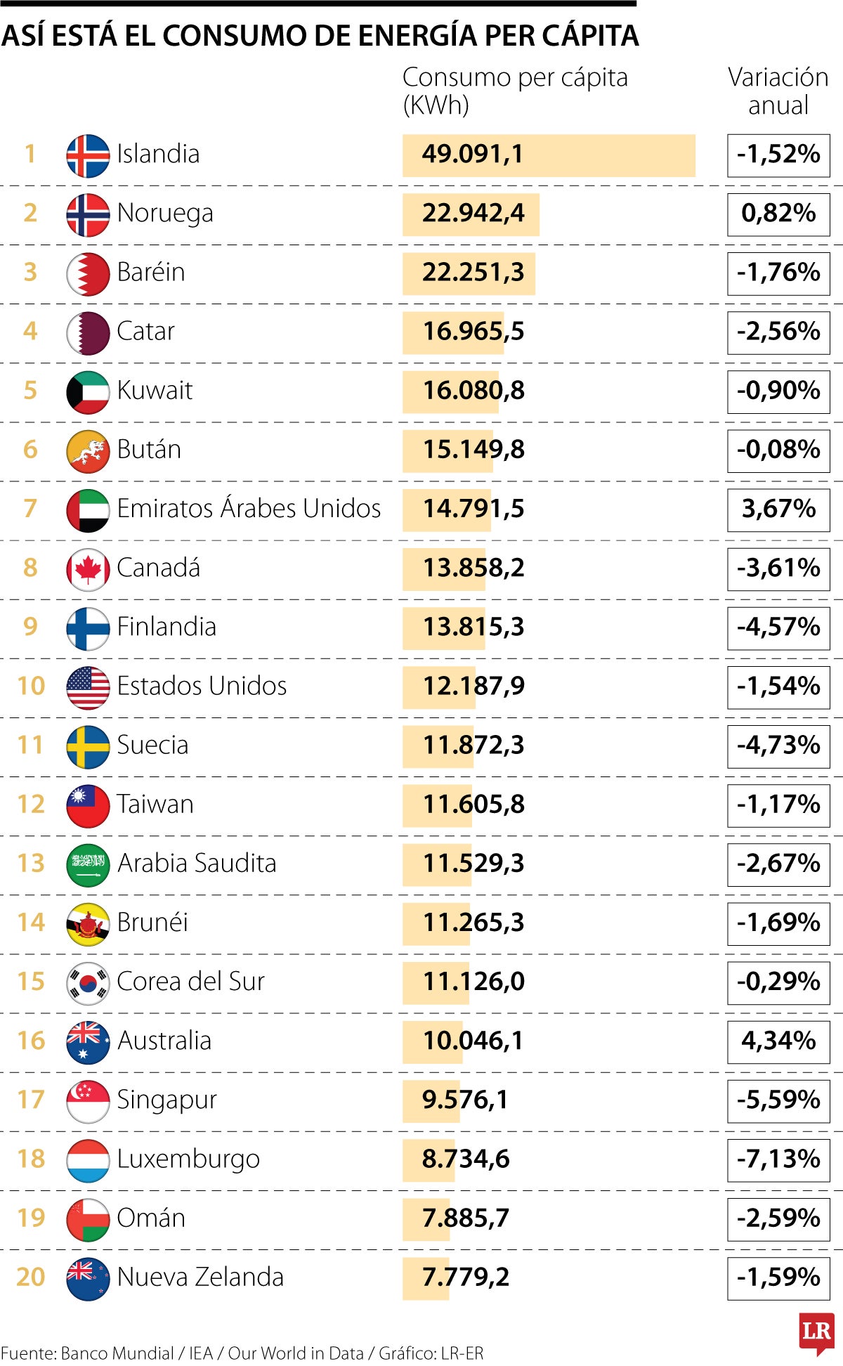 En el mundo, son Islandia, Noruega y Baréin los tres países con el mayor consumo per cápita de energía, cada uno con 49.091, 22.942 y 22.251 kilovatios-hora respectivamente. Los que completan el grupo de los cinco, son: Catar (16.965 kWh) y Kuwait (16.080 kWh).