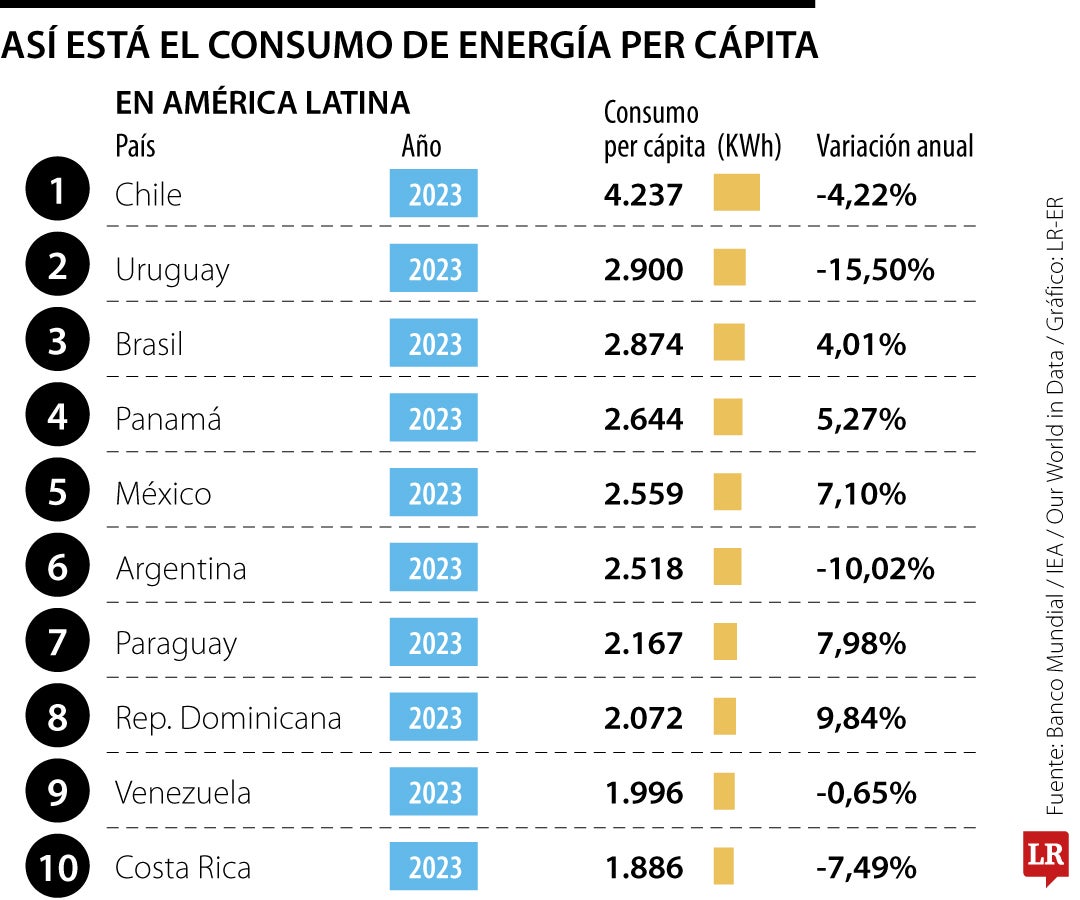Acá, Colombia se ubica en la casilla número 102 de los países con mayor consumo de energía por persona en el mundo, dentro de una lista de 188 naciones. En el caso de América Latina, Chile (4.237), Uruguay (2.900) y Brasil (2.874) son los que más registran consumo de energía por persona. Le siguen Panamá, México, Argentina, Paraguay, República Dominicana, Venezuela y Costa Rica para cerrar el grupo de los 10.