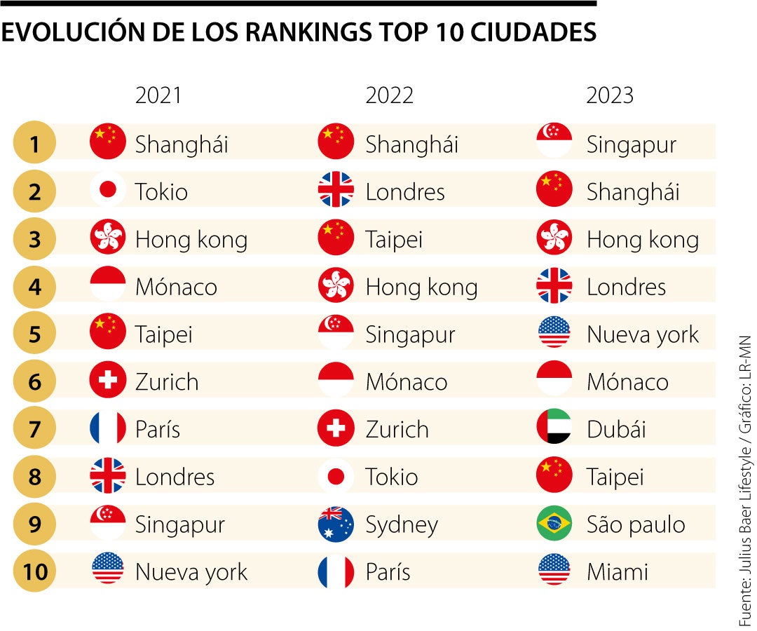 Las ciudades europeas descienden en la clasificación. Londres, el segundo lugar del año pasado, cae al cuarto y, aparte de que Mónaco se mantiene firme en el sexto lugar, la capital de Gran Bretaña es la única ciudad