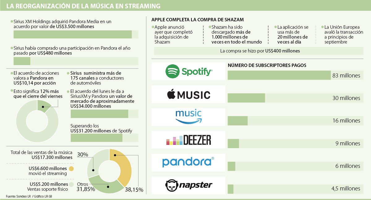 Un negocio que mueve US$6.600 millones al año se reorganiza con los negocios que anunciaron ayer Sirius y Apple, con la compra de Pandora y Shazam, respectivamente, hasta el punto que ponen en peligro el reinado de Spotify, que llega a más de 83 millones de suscriptores pagos.