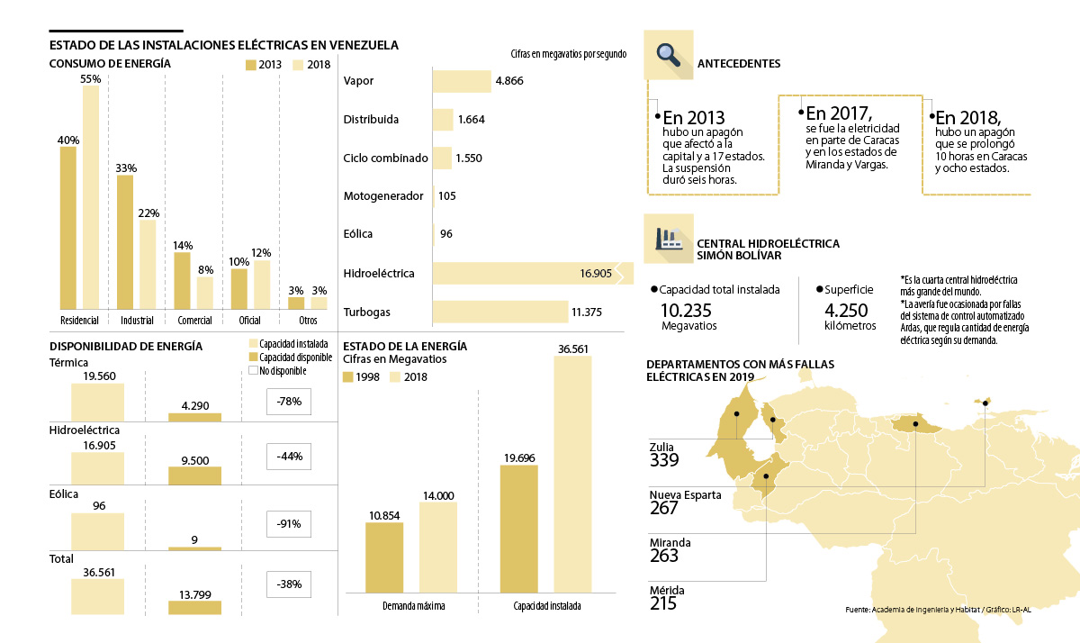 El último apagón registrado en Venezuela el pasado jueves, que obligó al cese de actividades escolares y laborales en 18 de los 24 departamentos del país, demostró que el sector de la energía, al igual que el de petróleo y gas, sufre graves problemas de mantenimiento y producción. Según la Academia de Ingeniería y Hábitat, la nación puede generar 36.561 megavatios por segundo, pero la satisfacción de demanda es de apenas 14.000 megavatios en el mismo lapso, lo que representa que el sistema eléctrico en uso en Venezuela es de apenas 38,2% de su capacidad.