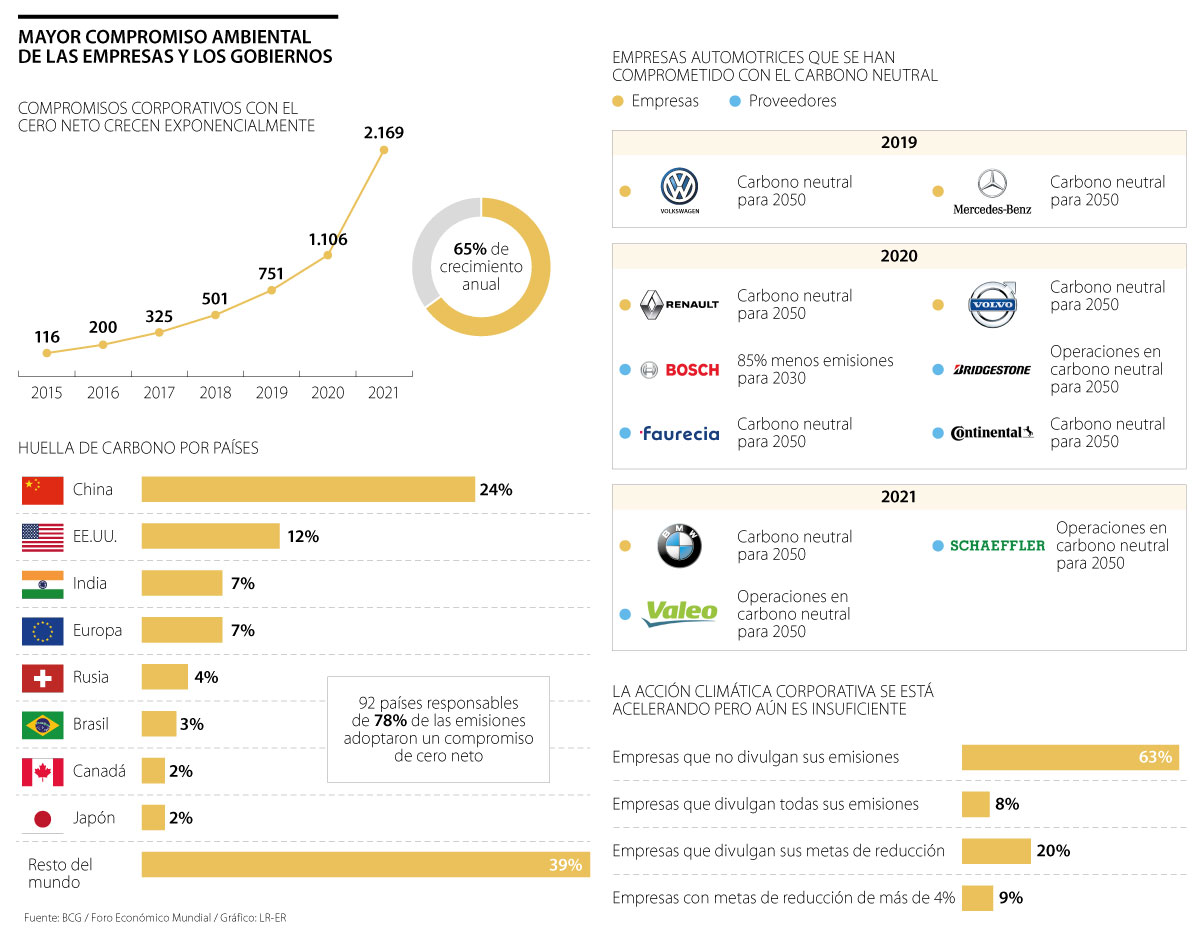 De acuerdo con un nuevo informe del Foro Económico Mundial y Boston Consulting Group, los compromisos de las empresas por alcanzar el cero neto de emisiones están en aumento de manera exponencial, con unas 2.169 empresas en todo el mundo que han establecido objetivos ambientales, en comparación con apenas 116 compañías que había en 2015, es decir que ha habido un crecimiento promedio de 65% anual, y de más de 1.600% en los últimos 7 años.