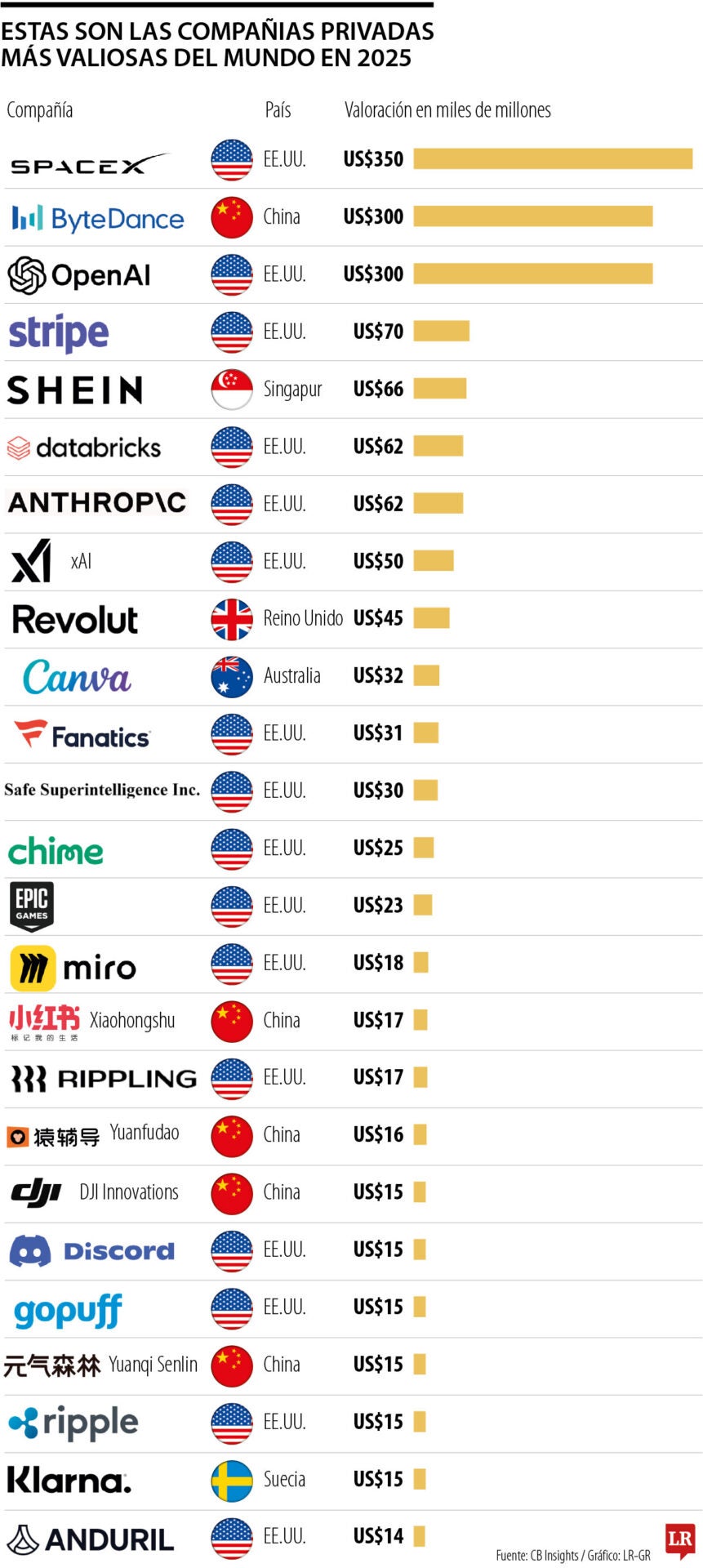 SpaceX, la compañía estadounidense de Elon Musk, es actualmente la empresa privada más valiosa del mundo, con una valoración estimada de US$350.000 millones. Le siguen ByteDance (China), OpenAI (EE.UU.), Stripe (EE. UU.) y Shein (Singapur).