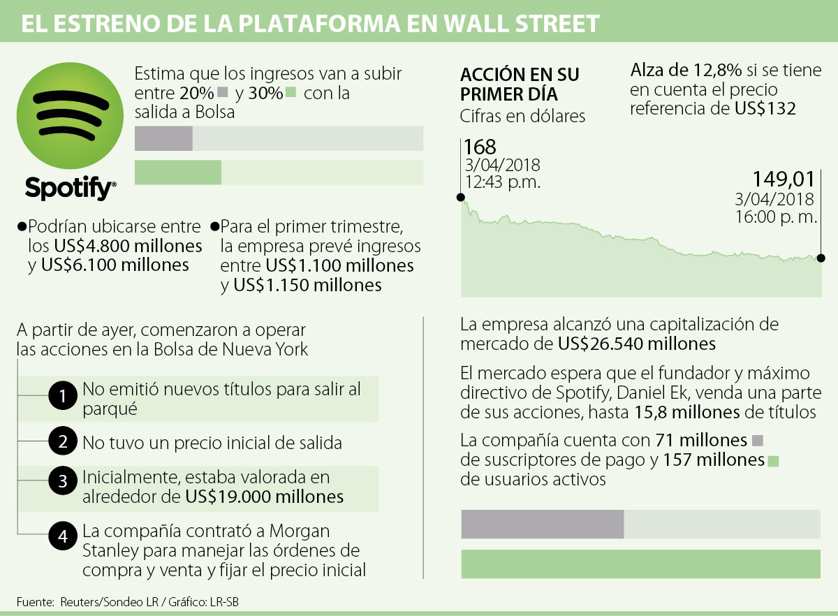 El debut en Wall Street de la plataforma de música Spotify estuvo lleno de curiosidades. No solo fue la oferta pública inicial que más tardó en iniciar a cotizar sus acciones, sino que su modelo de colocación directa marcó la jornada en Nueva York. Pese a que la acción redujo su tendencia en las últimas horas, al final logró un alza de 12,8% respecto a uno de los precios referencia establecidos previamente y alcanzó una capitalización bursátil de US$26.540 millones.