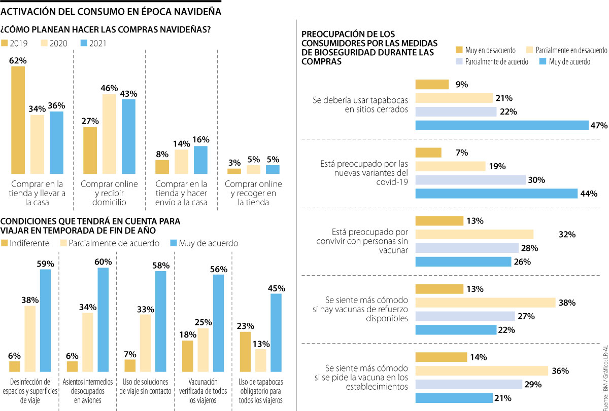 “La pandemia aceleró un proceso que quizás pudo ser más lento sin una crisis de salud pública como la que vivimos; indiscutiblemente la necesidad hizo que las personas estuvieran más dispuestas a descubrir y aprender nuevas formas de hacer compras a través de canales digitales, acercándolos a formas de pago y a experiencias que antes de ninguna manera se hubieran atrevido a realizar debido a la falta de conocimiento y confianza en esos procesos”, aseguró Yohanna Caicedo, directora de Research de Publicis Groupe. En cuanto a los viajes, la encuesta de IBM agrega que 39% de los consultados dice que planea viajar para ver a familiares y amigos durante las vacaciones. Esta cifra es superior al 28% del año pasado, pero sigue siendo un 36% más baja que en 2019.