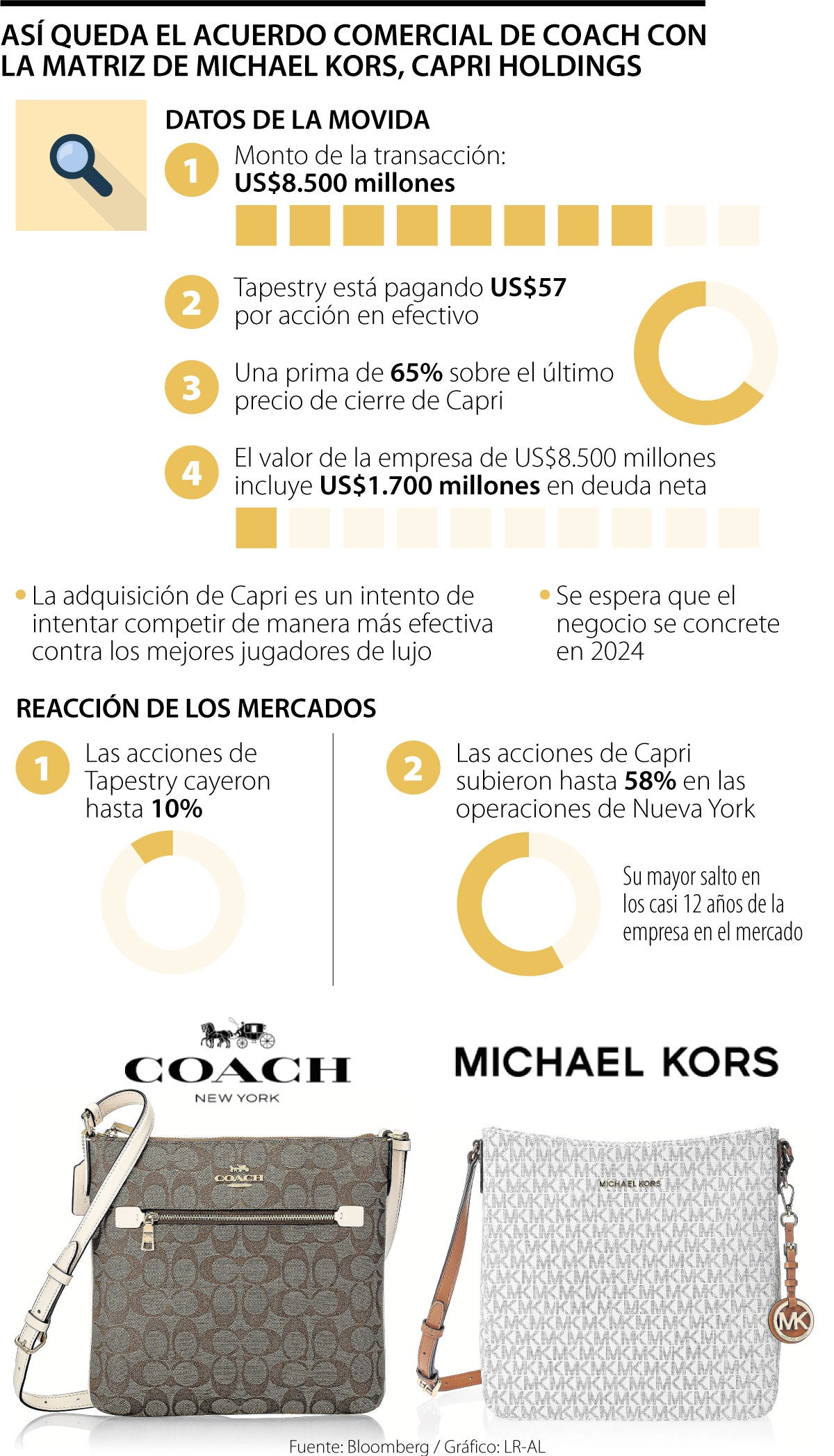 Tapestry, propietaria de marcas como Coach y Kate Spade, acordó adquirir la matriz de Michael Kors, Capri Holdings, en un acuerdo de US$8.500 millones que muestra que la ola de consolidación en el sector de artículos de lujo está lejos de terminar.