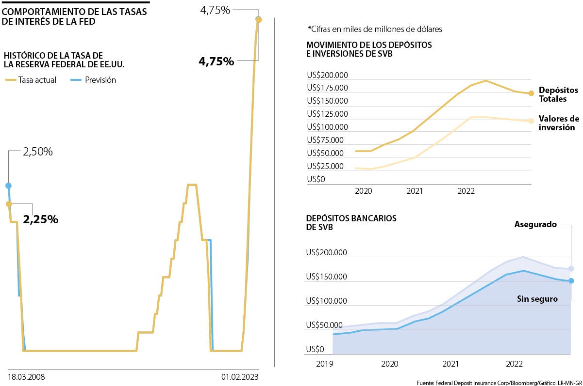 El alza de tasas por la Fed no solo afectó a este tipo de bancos, sino también a sus clientes, que en el caso de SVB son las startups, principalmente de tecnología, que hoy están necesitando liquidez por los mismos tipos y por los mayores costos debido a la inflación. Cuando las empresas comenzaron a necesitar el efectivo, “como era evidente, el banco no tenía en sus reservas todo el dinero para hacer frente a las salidas de capital, lo que lo forzó a tener que deshacer sus inversiones”, dijo Héctor Mohedano, experto en mercados de capital de deuda. Inversiones que, como ya se dijo, se encontraban en pérdidas. Los depósitos cayeron de US$200.000 millones a US$173.000 millones.