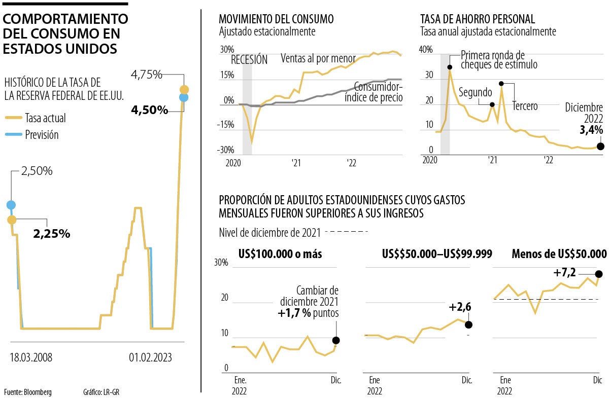 Ahora, en 2023, aquellas personas que ayudaron a mantener el gasto elevado se están quedando sin los mismos recursos para mantener el ritmo. La proporción de los ingresos mensuales que los estadounidenses reservaron para ahorrar fue del 3,4 % en diciembre, por debajo del 7,5 % del año anterior y de un máximo histórico en abril de 2020. En enero ese nivel se estima en menos de 3% el más bajo en tres años.