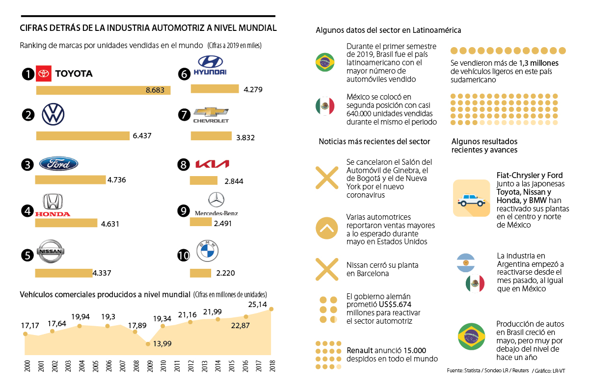 Al analizar cuáles son algunas de las compañías más afectadas del sector a nivel global se destacan Toyota, Volkswagen y Ford debido a que son las marcas líderes del segmento por el número de unidades vendidas. Según datos de Statista, la marca japonesa comercializó 8,6 millones el año pasado y la empresa alemana vendió 6,4 millones de vehículos, el pódium lo cierra la estadounidense Ford con 4,7 millones de autos.