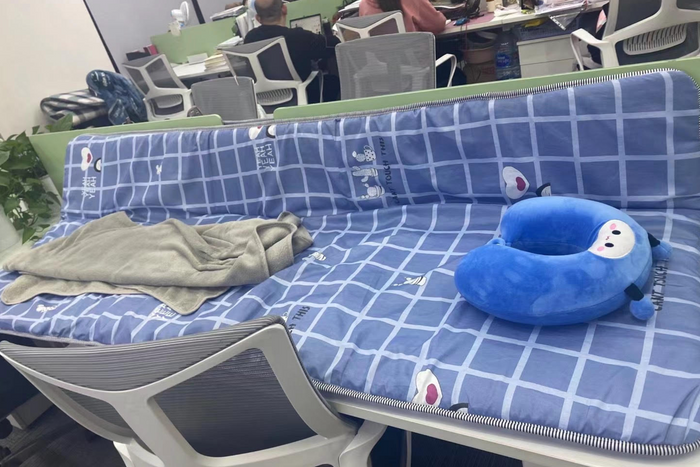 Arreglos para dormir en la oficina del residente de Shanghái Yan Yuejin, analista inmobiliario. FOTO: YAN YUEJIN