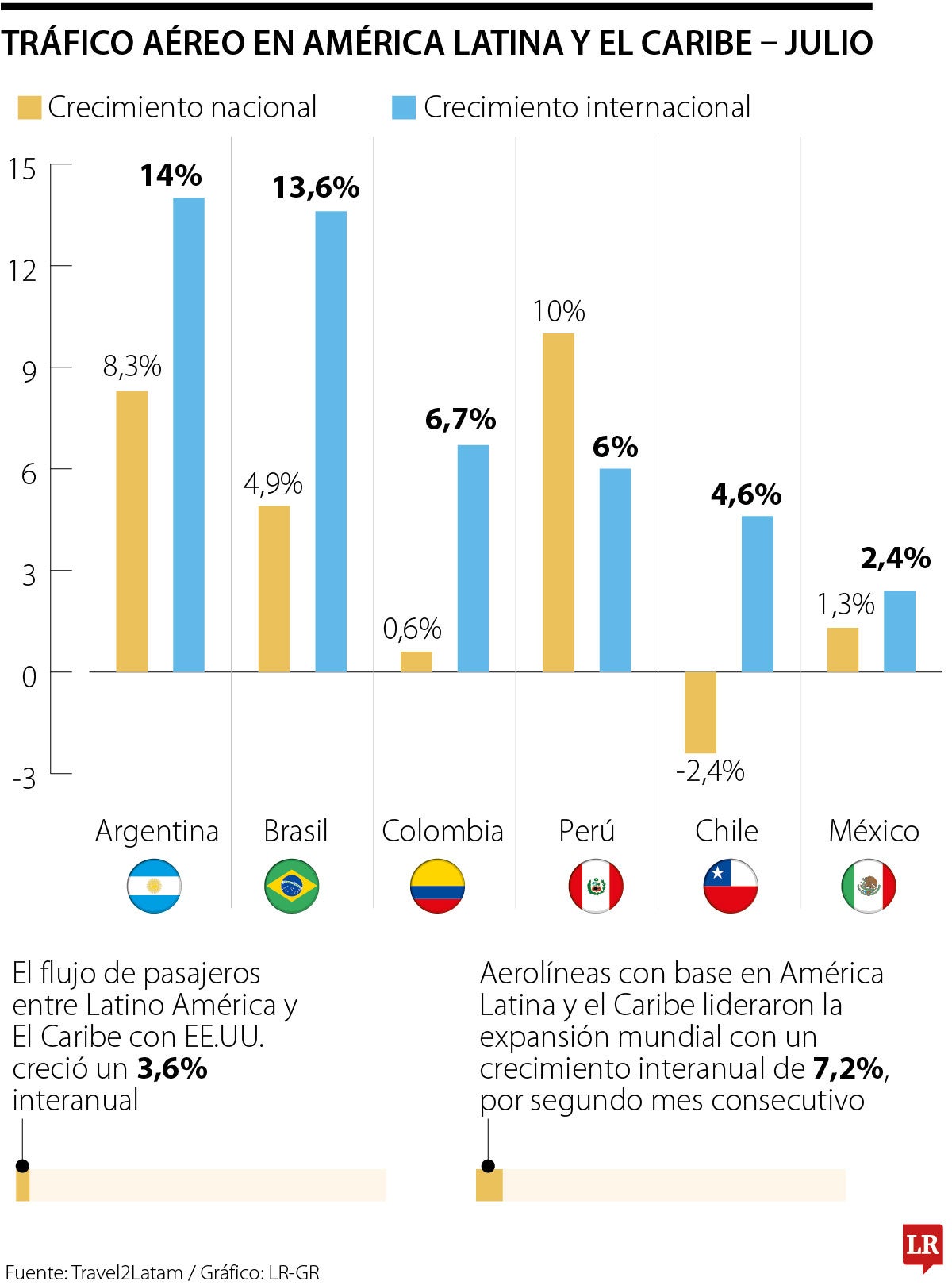 El dinamismo del tráfico aéreo en América Latina se consolidó en julio, con un crecimiento interanual de 7,2% en las aerolíneas con base en la región, cifra que superó en un punto porcentual el avance de junio, según cifras de Travel2Latam. Este desempeño, el más alto a nivel mundial por segundo mes consecutivo, se explicó en gran medida por el tráfico intrarregional, que representó más de 60% del aumento neto, y por la sólida demanda en rutas hacia Estados Unidos.