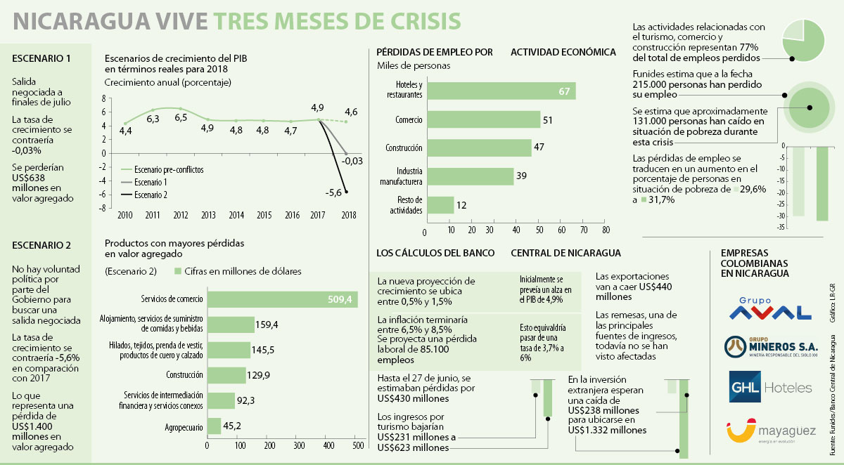 La entidad puntualiza que, de darse una salida negociada antes de finales de julio, la tasa de crecimiento económico de Nicaragua se contraería 0,03% y se perderían US$638 millones en valor agregado frente a las cifras de 2017. Sin embargo, si no hay voluntad política del Gobierno para hablar con los manifestantes, tal como ha venido sucediendo, la tasa de crecimiento se reduciría 5,6% y se perderían US$1.400 millones en valor agregado en comparación con el año pasado. Todo esto en una economía que a duras penas llega a los US$13.000 millones.