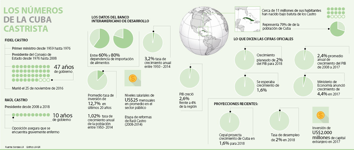 A estos retos se suman los datos suministrados por el Banco Interamericano de Desarrollo. Según la entidad, el nivel de dependencia de importación de alimentos de la isla se ubica entre 60% y 80% y su tasa de inversión es una de las más bajas en comparación con la región al establecerse en 12,7% en los últimos 20 años. Además, el PIB tiene 3,2% como tasa de crecimiento anual entre 1950 y 2014 y creció 2,6% frente a 4% de la región, periodo que tiene en cuenta la etapa de reformas de Raúl Castro entre 2008 y 2014.